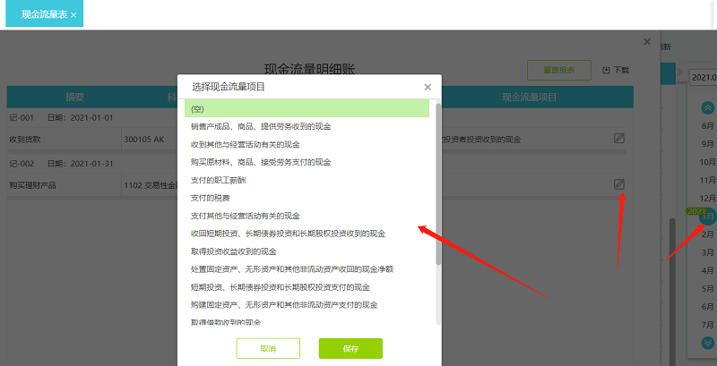 ①【報(bào)表中心】——【現(xiàn)金流量表】——【明細(xì)】,找出未參與計(jì)算的憑證,【編輯】修改,修改至應(yīng)分配的現(xiàn)金流量項(xiàng)目中,需要手工匹配現(xiàn)金流量名稱。