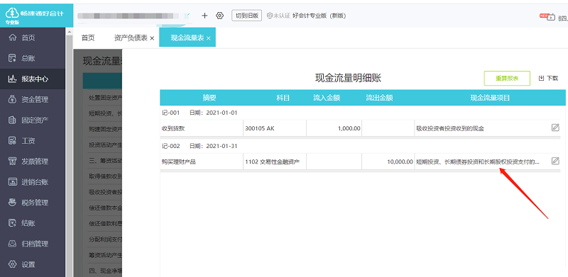 匹配好現(xiàn)金流量名稱之后,【報(bào)表中心】——【現(xiàn)金流量表】——【明細(xì)】,之前涉及每個(gè)月的報(bào)表需要點(diǎn)重算報(bào)表,沒(méi)有做憑證的月份系統(tǒng)自動(dòng)匹配現(xiàn)金流量名稱