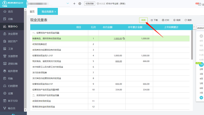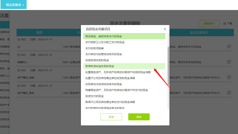 2.如系統(tǒng)匹配“現(xiàn)金流量項目”匹配不正確,可點擊現(xiàn)金流量表右上角的明細,進行手動進行修改。如圖所示: