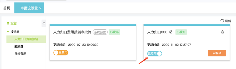 1)自定義的審批流只有啟用后才能生效。且一個單據(jù)類型只能有一個啟用的審批流程;