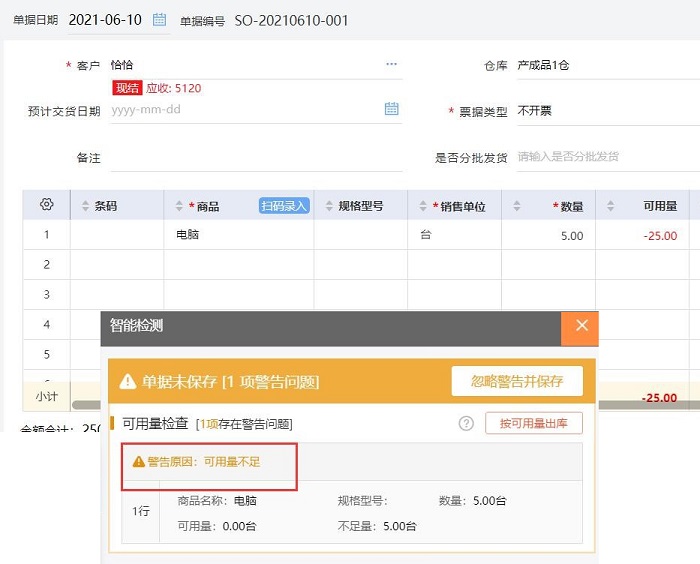 二、開啟現(xiàn)存量管控后,無論賬套中是否開啟銷貨單審核或是否開啟庫管確認(rèn)出庫功能,當(dāng)銷貨單錄入的數(shù)量大于商品可用量時,銷貨單保存時出現(xiàn)錯誤提示: 可用量不足,并且不允許單據(jù)的保存。