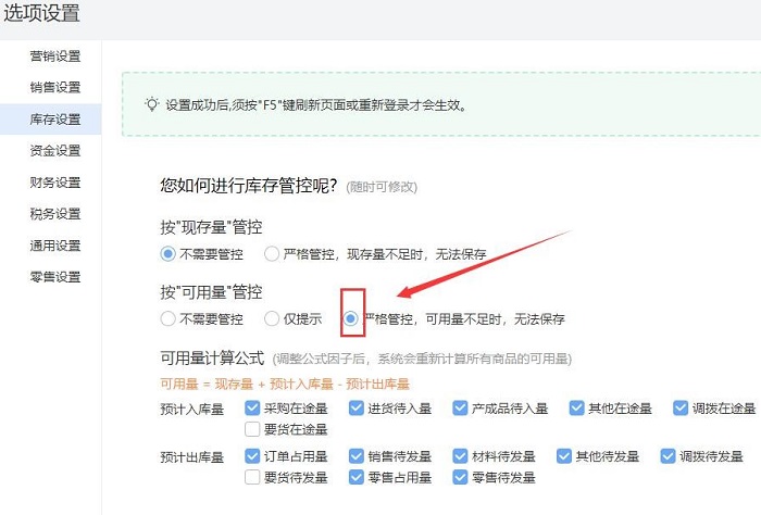 一、登陸好業(yè)財軟件,進入【系統(tǒng)管理】-【選項設(shè)置】-【庫存設(shè)置】,在按可用嚴(yán)格管控中勾選嚴(yán)格管控。