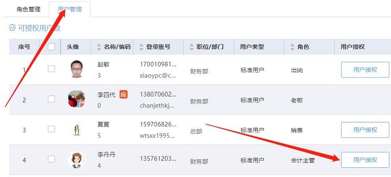 進(jìn)入【基礎(chǔ)信息】-【部門員工】中新增員工信息,之后點(diǎn)擊【授權(quán)】,選擇到相應(yīng)的角色,之后在【權(quán)限設(shè)置】-【角色管理】里就能看到。