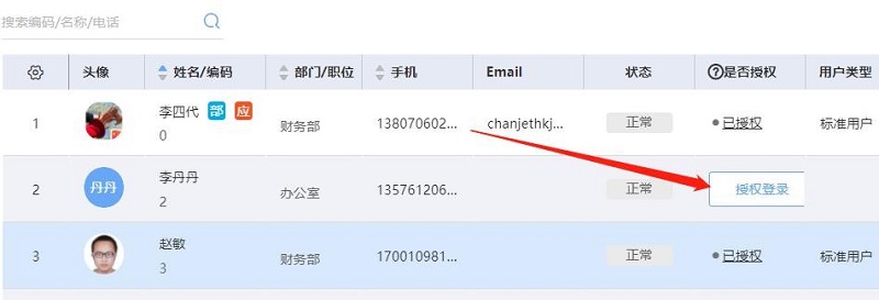 1、進(jìn)入【基礎(chǔ)信息】-【部門員工】中新增員工信息,之后點(diǎn)擊【授權(quán)】登錄(授權(quán)登錄的時(shí)候需要選到某個(gè)角色)。