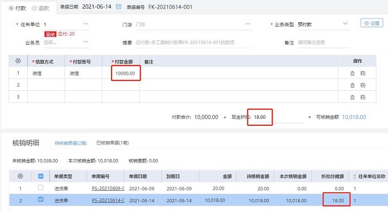 在彈出的付款界面上,錄入【結(jié)算方式】、【付款賬號】、【付款金額】10000 元,下方錄入【現(xiàn)金折扣】金額 18 元,直接保存。