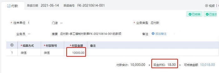 確認(rèn)付款時,點(diǎn)擊【資金管理】-【付款單】,新增一張付款單,選擇往來單位, 因為類型為【應(yīng)收款】,錄入結(jié)算方式、付款賬號,付款金額為 10000。同時付款明細(xì)右下角的【現(xiàn)金折扣】中錄入本次要抹零的金額為 18 元。