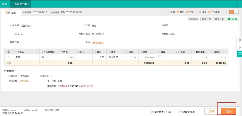 如果不是單獨(dú)填制付款單,而是在進(jìn)貨單上進(jìn)行付款時,打開對的進(jìn)貨單,點(diǎn)擊右下角的【付款】按鈕。