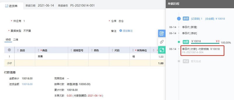 錄入完成后,保存審核單據(jù)。對應(yīng)的進(jìn)貨單即已全部核銷完畢,不存在未核銷金額。