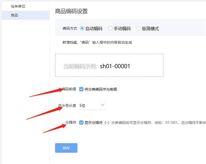2、自動編碼中可選擇是否將分類作為編碼前綴,設(shè)置流水號長度以及是否需要分隔符號。