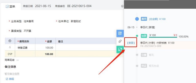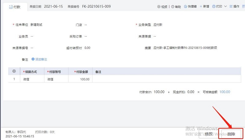 2、點擊單據(jù)歷程中付款核銷記錄旁邊的【查看】按鈕,打開付款單記錄。點擊【刪除】按鈕刪除。