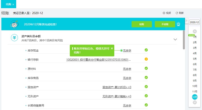 1. 點(diǎn)擊左側(cè)菜單【結(jié)賬】-【結(jié)賬】,好會(huì)計(jì)會(huì)檢查該月的賬表,檢查是否有賬務(wù)風(fēng)險(xiǎn)的情況,賬務(wù)異常標(biāo)紅色則無法結(jié)賬,橙色綠色沒有異?梢砸绘I結(jié)賬,并且能直接定位錯(cuò)賬數(shù)據(jù),簡(jiǎn)單操作直接修改,極大減少財(cái)務(wù)結(jié)賬核對(duì)的時(shí)間;