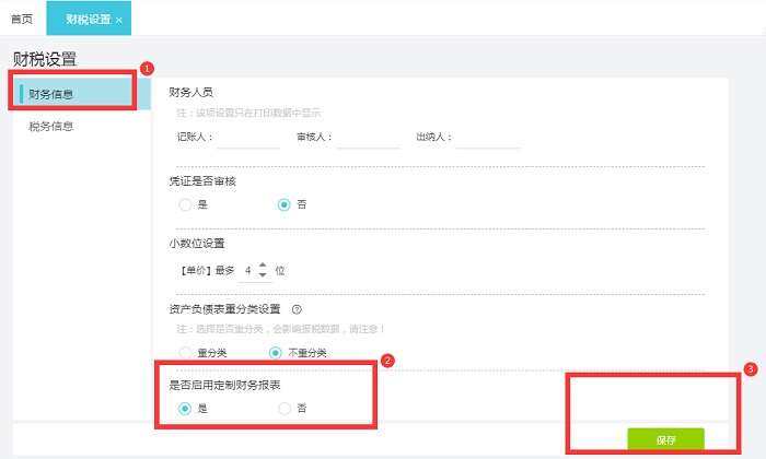 進(jìn)入【設(shè)置】-【財(cái)稅設(shè)置】,在“財(cái)務(wù)信息”中,找到“是否啟用定制財(cái)務(wù)報(bào)表”,勾選“是”再點(diǎn)擊保存。