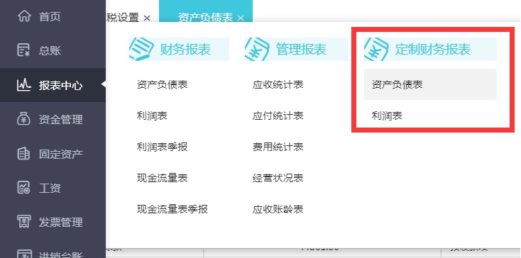 進(jìn)【報(bào)表中心】,在“定制財(cái)務(wù)報(bào)表”頁(yè)簽下,可以看到可進(jìn)行自定義的“資產(chǎn)負(fù)債表“和“利潤(rùn)表”,可點(diǎn)擊進(jìn)入自定義編輯