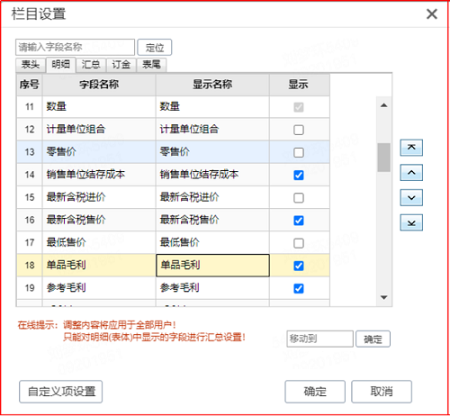 1.在【銷售訂單】界面,依次點擊上方工具欄的【設置】-【單據(jù)設置】,在彈出的【欄目設置】窗口,選擇【明細】頁簽,勾選顯示【單品毛利】、【參考毛利】和【銷售單位結(jié)存成本】。