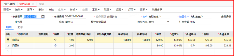 2.返回【銷售訂單】界面,新增一張銷售訂單,【倉庫】選擇為商品倉,表體明細填寫商品A和商品B兩種存貨,可發(fā)現(xiàn)商品A的銷售單位結(jié)存成本為12,單品毛利等于單價120-12=108,參考毛利等于108*1=108,而商品B由于無銷售單位結(jié)存成本、所以單品毛利及參考毛利無法進行取值。