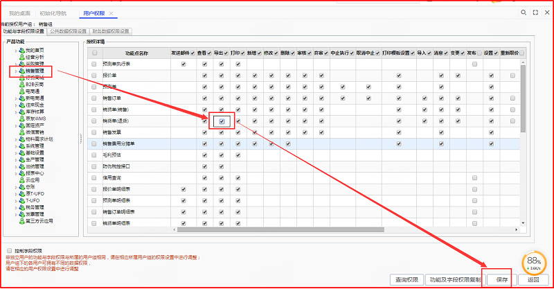 2、點(diǎn)擊銷(xiāo)售管理,然后把銷(xiāo)銷(xiāo)貨單(退貨),勾選上導(dǎo)出,點(diǎn)擊保存。