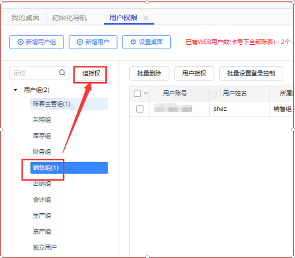 1、用賬套主管登錄軟件,然后點(diǎn)擊用戶(hù)權(quán)限,選擇用戶(hù)所在的組,點(diǎn)擊組授權(quán)。