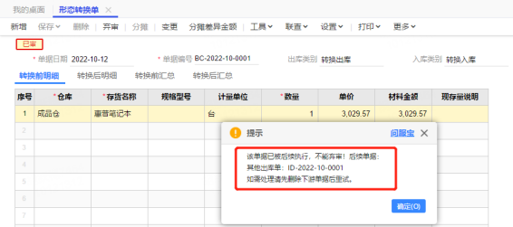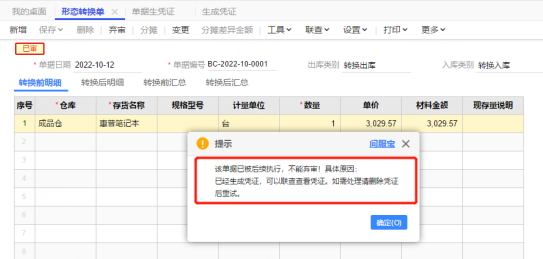 正常情況下,形態(tài)轉(zhuǎn)換單自動生成的其他入庫單和其他出庫單審核了或者生成了憑證,棄審的時候會提示